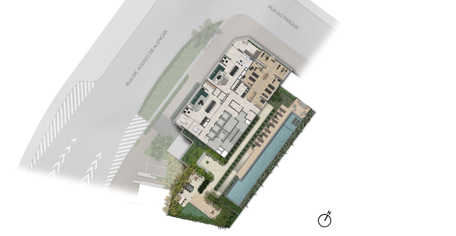 1. Salão de Festas; 2. Salão de Jogos; 3. Coworking; 4. Lounge Leitura; 5. Sala de Spinning; 6. Fitness; 7. Brinquedoteca; 8. Praça Central; 9. Playground; 10. Lounge Churrasqueira; 11. Solarium; 12. Piscina Infantil; 13. Piscina Recreativa; 14. Piscina com raia de 25m;